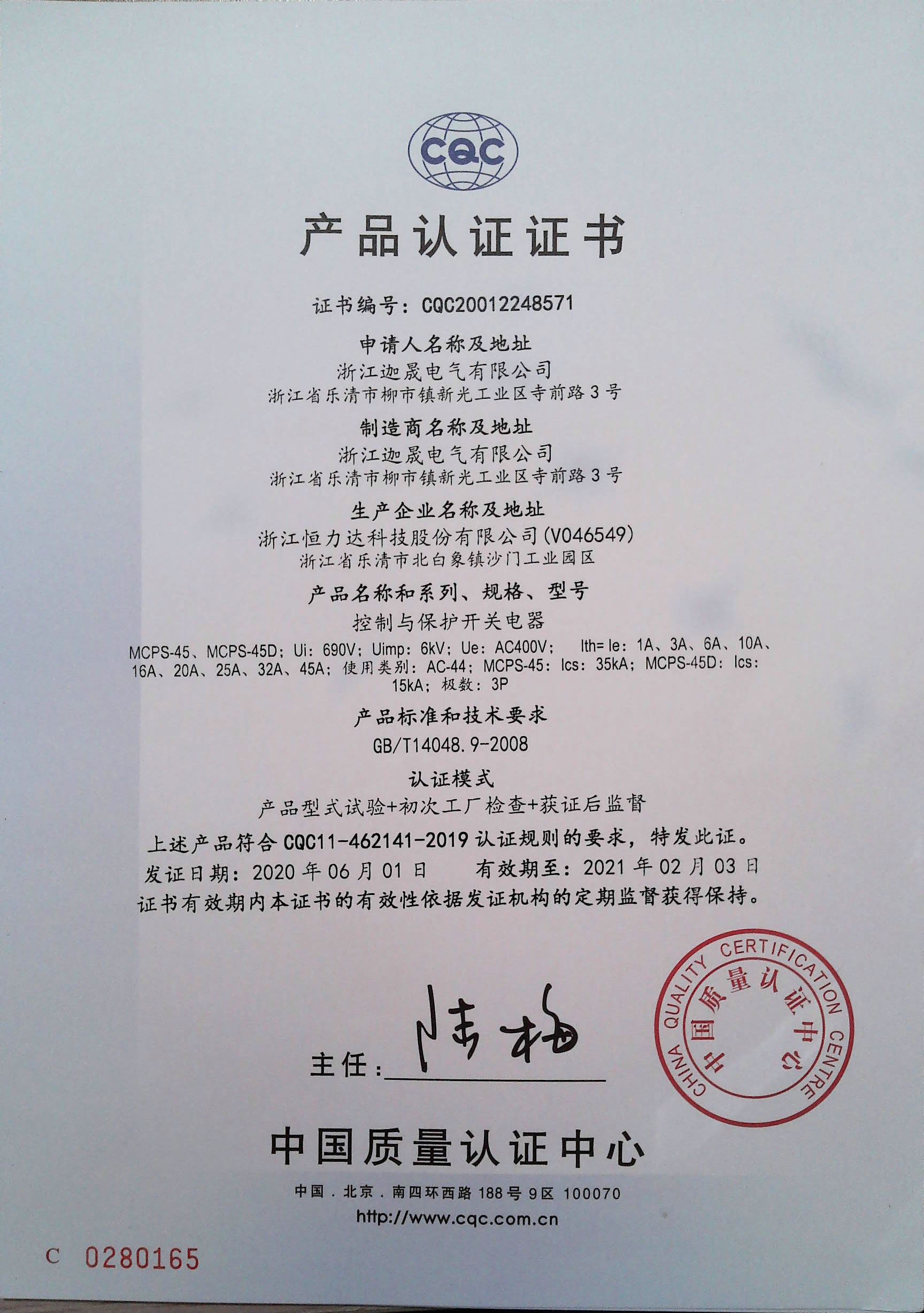 MCPS-45控制保护开关CCC证书